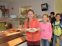 Jeden Mittag bietet die Schule in Zusammenarbeit mit La cucina vitale ein DGE-zertifiziertes Mittagessen im Neuen Forum an.