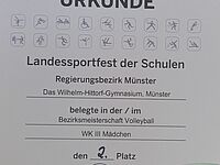 Auch in dem diesjährigen Volleyballturnier der Landesmeisterschaften nahm das Wilhelm-Hittorf-Gymnasium erfolgreich teil. Nach einer gelungenen Qualifikation bei den Bezirksmeisterschaften durften die Volleyballer/innen des WHG gegen elf weitere Qualifikanten des Landesfinales in Marl konkurrieren.