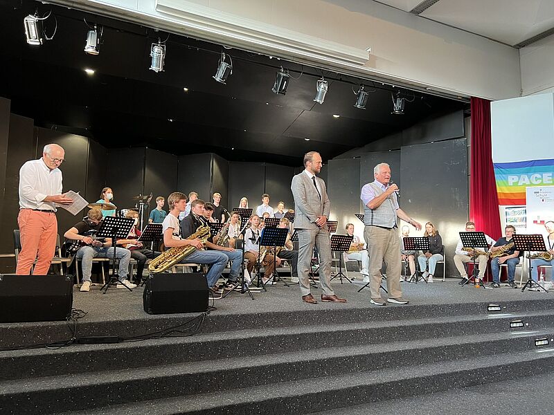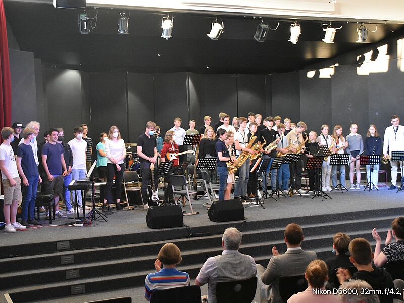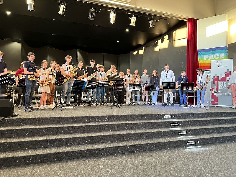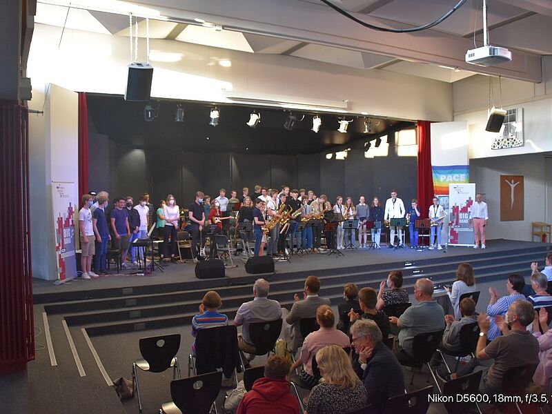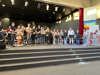 Mit dabei neun Abitiurientinnen und Abiturienten der Friedensschule, die den Prüfungsraum vom morgen gegen die Musikbühne am Abend sichtlich erleichert tauschten.