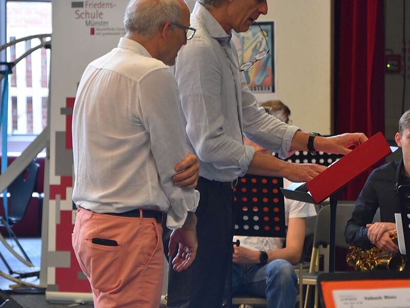 Sichtlich mit Stolz präsentierten die Workshopsleiter Dieter Niermann (Friedensschule) und Klaus Posingies (Hittorf-Gymnasium) das gemeinsame Ergebnis des Workshops: Jazzige Klänge, swingende Rhythmen, tolle Bläsersätze und insgesamt ein sehr unterhaltsames Programm konnte am gestrigen Donnerstag auf die Bühne in der gut gefüllten Aula der Friedensschule gebracht werden.