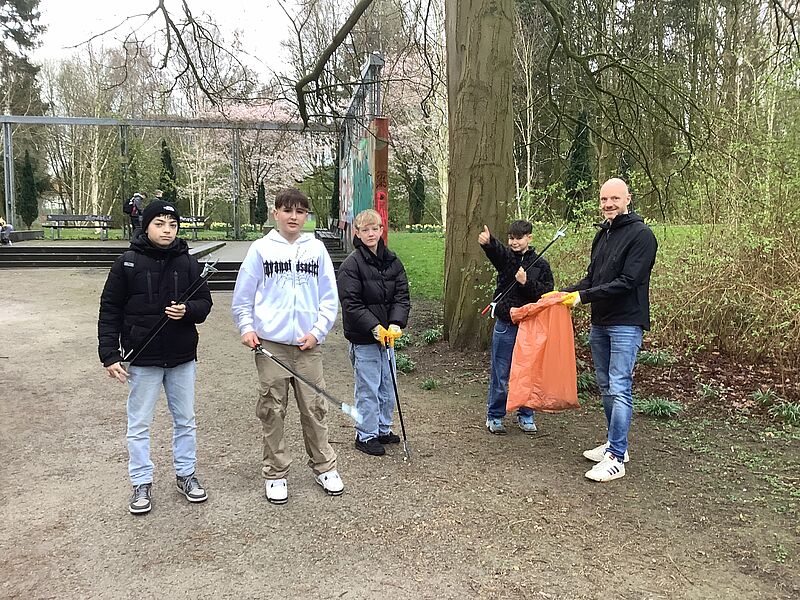 Eine Gruppe von Schüler*innen aus der Stufe Q2 hat sich sogar aus eigener Verantwortung heraus an der Aktion angemeldet. Initiiert von Jakob Kronlage und Malte Cox sammelten weiteren Mitstreiter*innen aus der Q2 ebenfalls im Schulumfeld. Dass sich diese Schüler*innen so kurz vor ihrem Abitur einfach aus eigenem Engagement für die Umwelt und die Schule einsetzen, finde ich besonders beeindruckend.