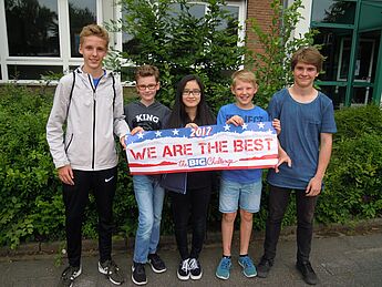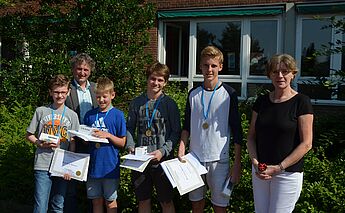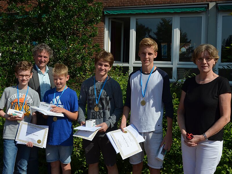 Nachdem nach Bekanntgabe der Ergebnisse in den einzelnen Klassen bereits Urkunden, Poster und kleine Sachpreise verliehen wurden, wurden nun auch die Jahrgangsbesten ausgezeichnet. Ihre besondere Auszeichnung (Urkunde, Medaille und attraktive Preise) nahmen als Jahrgangsbeste in Empfang: