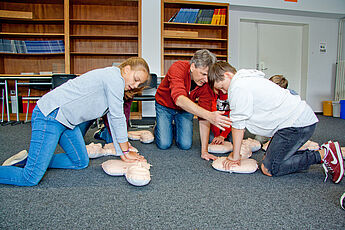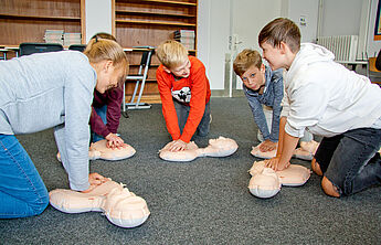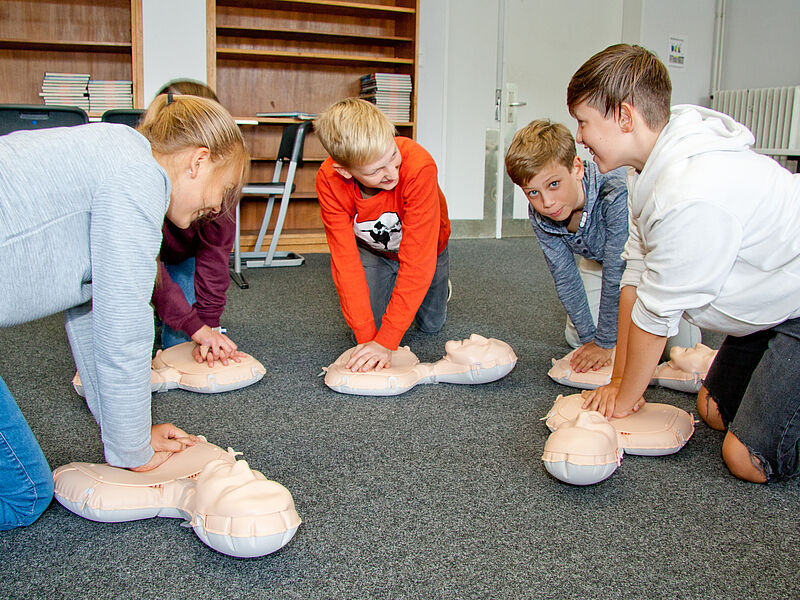 „Ihr könnt nichts falsch machen, es sei denn, ihr macht gar nichts“, erklärt Ralf Epping, Fachkrankenpfleger für Anästhesie- und Intensivpflege auf der Intensivstation der Raphaelsklinik. Zwischen dem Gymnasium und der Innenstadtklinik sorgt ein Kooperationsvertrag dafür, dass jedes Jahr die Schüler der siebten Klassen unter Anleitung eines Experten die Grundlagen der Wiederbelebung erlernen. Während der aktuellen „Woche der Wiederbelebung“ wurden so aus rund 120 Schülerinnen und Schülern junge Ersthelfer, die im Ernstfall genau wissen, was zu tun ist. Viele Schüler haben in den Medien den Bericht über einen 83-Jährigen verfolgt, der in einer Essener Bankfiliale gestorben ist, weil ihm niemand geholfen hat, als er bewusstlos am Boden lag. „Ihr hättet den Mann mit Herzdruckmassage bis zum Eintreffen des Rettungsdienstes vermutlich retten können“, erklärt Epping.