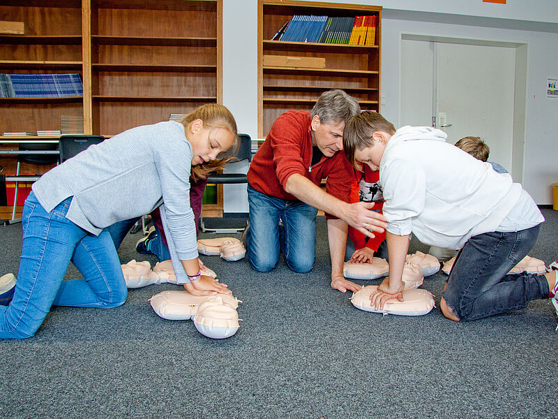 Erst schütteln und laut ansprechen, dann die 110 anrufen, möglichst weitere Personen dazu holen und mit der Wiederbeleben beginnen, die Schüler kennen jetzt die notwendigen Schritte, um Leben zu retten. Welche Informationen die Notrufzentrale am Telefon benötigt, kann Kleris seinen Klassenkameraden genau erklären, er hat bereits zweimal den Notruf gewählt. „In welchem Rhythmus soll man die Herzdruckmassage ausführen, da gibt es so ein Lied, an das man denken soll“, fragt Ralf Epping in die Runde und sofort singt einer der zukünftigen Ersthelfer „Staying alive“ von den Bee Gees. Der Krankenpfleger ist begeistert, stellt aber auch gleich klar, dass die Schüler einfach etwa hundertmal pro Minute drücken sollen, auch wenn sie das Lied nicht kennen.
