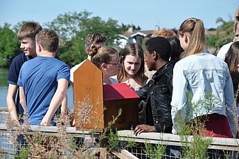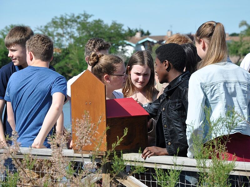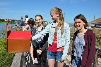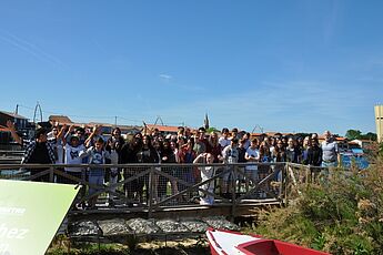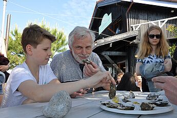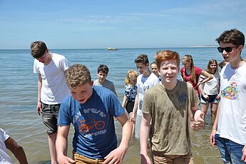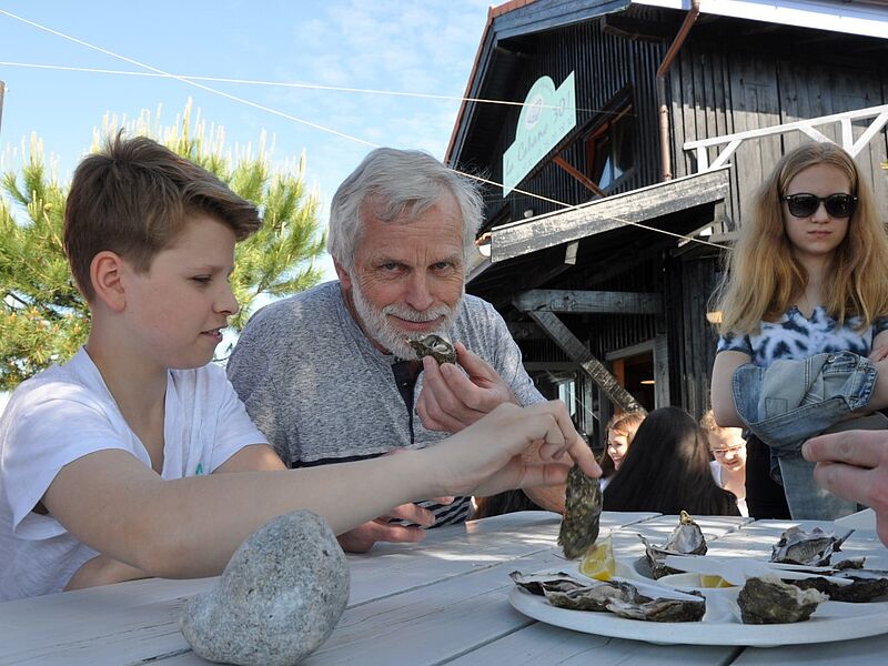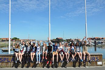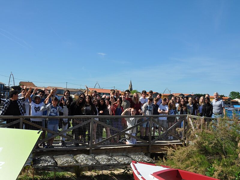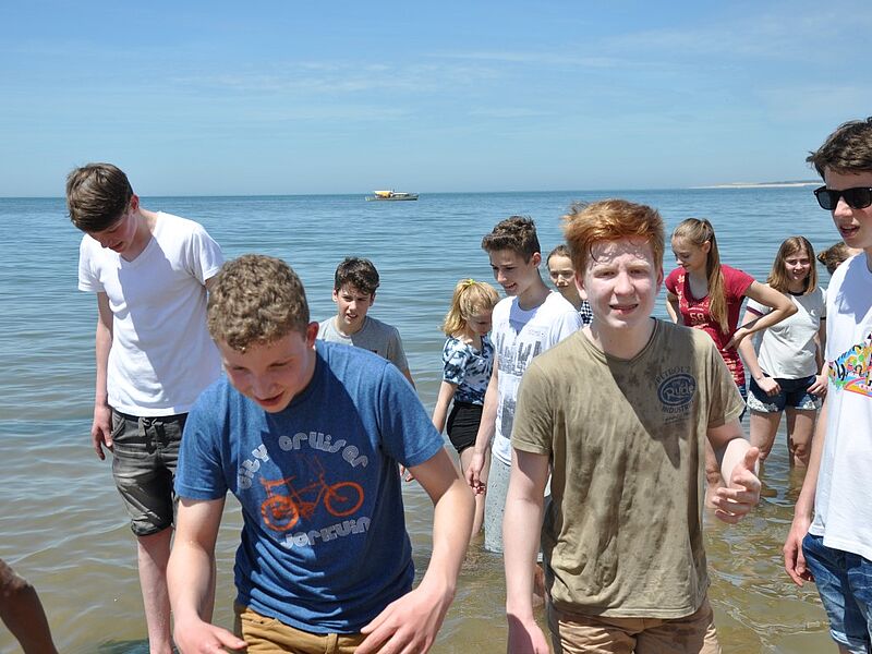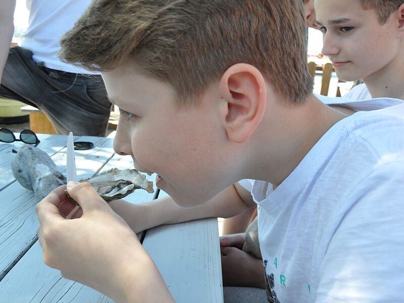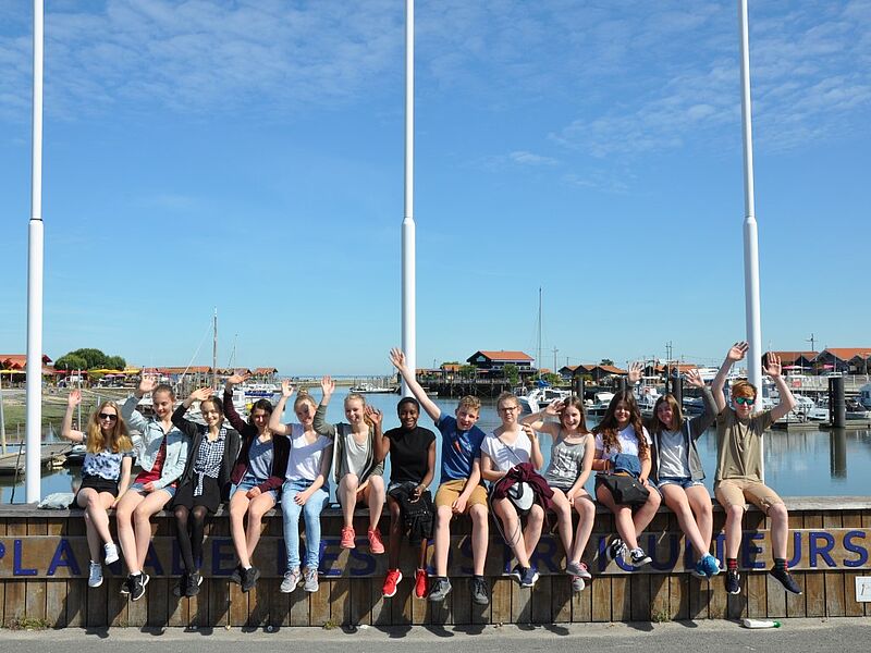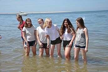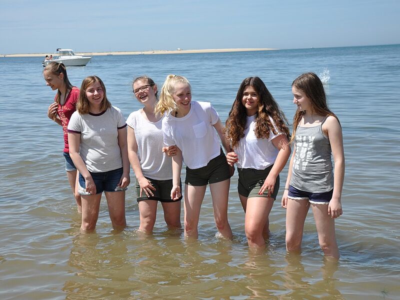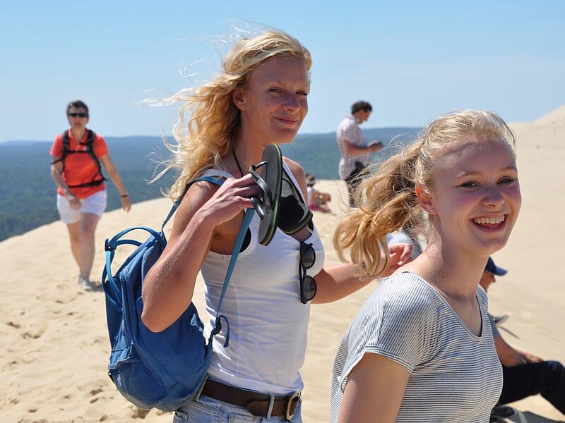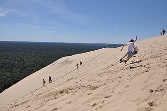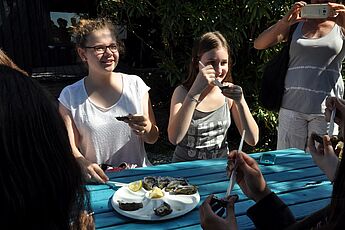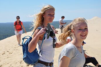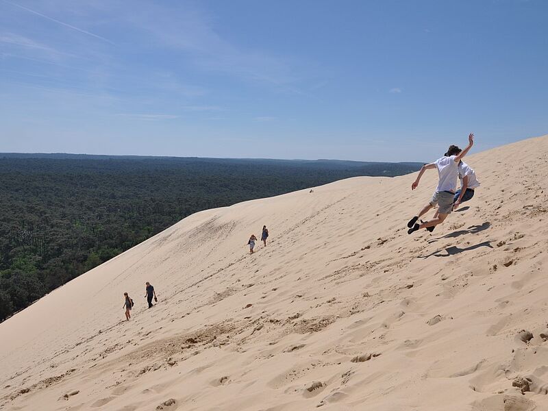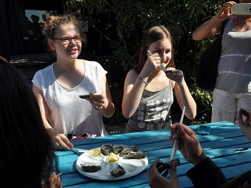 Und der erste Austauschtag sollte unmittelbar zu einem großen Erfolg werden. Schon am Dienstag ging es mit den Partnern zum Becken von Arcachon. Nach der Besichtigung des Austernmuseums von Gujan-Mestraas und der zögerlichen Verkostung von Austern stürmten die Hittorfer die Dune de Pyla, die größte Wanderdüne Europas. Bei strahlendem Sonnenschein, aber noch kaltem Atlantikwasser reichte der Badespaß nur zu einem kurzen Fußbad.