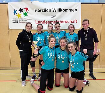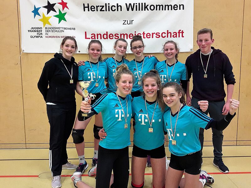 Die Nachnominierung wurde mit großer Freude angenommen. Somit ging es am Dienstag zu den Landesmeisterschaften ans Freiherr-vom-Stein-Gymnasium in Münster. Hier standen in der Vorrunde die Begegnungen mit den Bezirksmeistern aus Arnsberg und Köln an. Die erste Begegnung mit dem Gymnasium aus Schwerte verlangte vom Co-Trainer Kaufmann ein gutes Fingerspitzengefühl und taktisches Können. Das Spiel auf Augenhöhe konnten die Schülerinnen jedoch in zwei engen Sätzen für sich gewinnen und somit den ersten Sieg feiern. Im zweiten Spiel gegen das Hardtberg-Gymnasium aus Bonn zeigten alle sieben Spielerinnen ihre Qualitäten und gewannen ebenfalls mit schönen Angriffen und einer guten Teamleistung das Spiel.