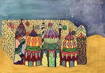 Wir finden, dass Artjom Brehm, Amy Jacob, Emily Meiländer, Luis Koch aus der 5a jeweils ihren „Palast der tausend Farben“ sehr gekonnt zum Ausdruck gebracht haben und gratulieren zu dieser Leistung.