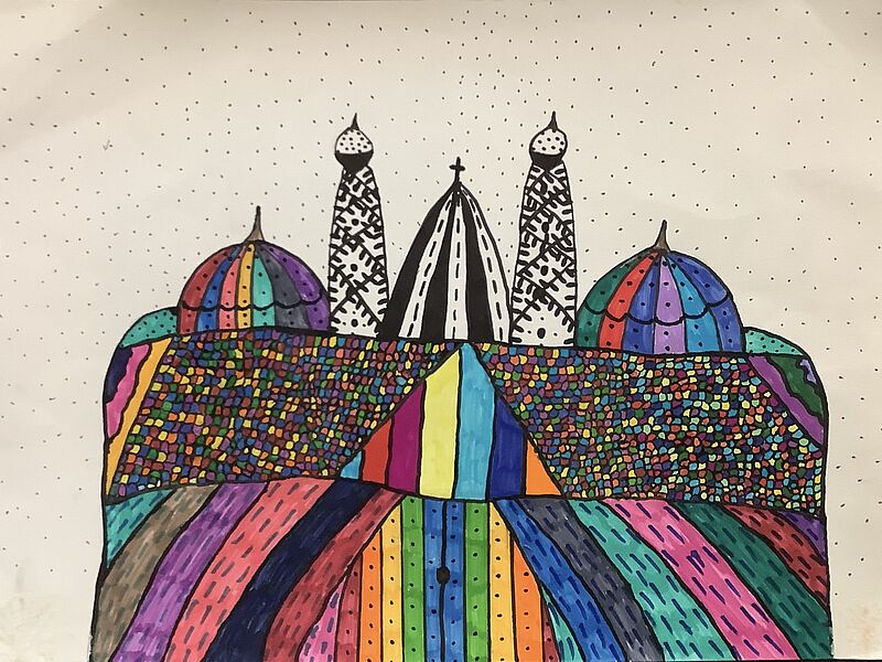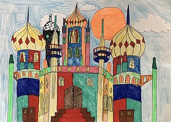 Wie sah wohl der Palast der tausend Farben einmal aus? Genau das haben die die Schülerinnen und Schüler der Klasse 5a gefragt, als sie sie ausgiebig mit dem Thema Primar-, Sekundär- und Tertiärfarben auseinandersetzten. Aufgabe hier war es, die eigene individuelle Vorstellung von dem „Palast der tausend Farben“ zeichnerisch und malerisch zu gestalten.