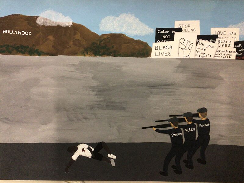 Das Bild des Monats Dezember entstand in einem Q1 Kunst Grundkurs im Zusammenhang mit der Werkbetrachtung „Erschießung der Aufständischen“ von 1808 des Künstlers Francisco de Goya. Die gestaltungspraktische Aufgabe in diesem Zusammenhang bestand darin eine Hommage an Goyas Werk malerisch zu entwickeln, indem entweder das gesamte Werk oder Bildelemente daraus neu interpretiert werden bzw. in einen neuen Kontext gesetzt werden konnten. Liv Döker hat sich in diesem Zusammenhang dafür entschieden, ein Thema aufzugreifen, das zu einer internationalen Bewegung geworden ist. Das erneute brutale Vorgehen einiger Polizisten in den USA in diesem Jahr, welches dazu führte, dass George Floyd festgenommen und erschossen wurde, löste eine Protestwelle gegen Gewalt und Rassismus aus, die über die USA hinausgeht. „Black lives matter“, dieser Satz ist symbolisch für die Bewegung, die sich klar gegen Rassismus und Gewalt richtet.