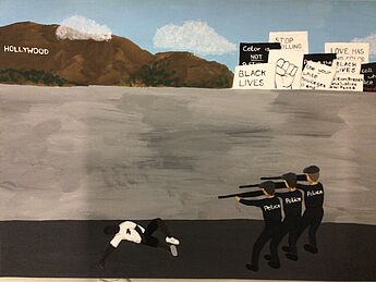 Die BetrachterInnen des Bildes von Liv werden Zeugen einer Situation, in der drei bewaffnete Menschen in Polizeiuniform einen einzelnen Menschen mit dunkler Hautfarbe erschossen haben und noch auf ihn mit Gewehren zielen. Dieser Mann liegt auf dem Boden. Keiner ist da, außer den Tätern. Die Szenerie spielt vor einer kahlen Mauer. Dahinter ist eine Hügellandschaft mit der Hollywood-Schrift zu sehen und die Plakate der daraus hervorgegangenen „Black-lives-matter-Bewegung“. Ist der Vordergrund in tristen Farben gehalten, wurde der Hintergrund im Kontrast farbig gemalt. Liv gelingt es in ihrer Malerei, durch einen gezielten Bild- und Farbaufbau das vor ihr gewählte Thema pointiert zum Ausdruck zu bringen und ein Zeichen gegen Rassismus und Gewalt zu setzen.