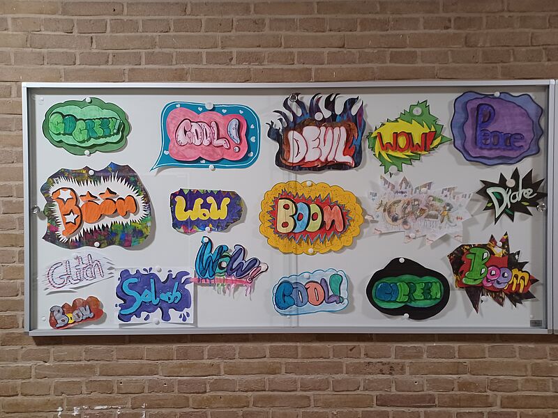 Zum Ende des 1. HJ. setzte sich die Klasse 7b lange mit dem Thema Graffiti auseinander. Neben der Geschichte des Graffiti, übten die Schülerinnen und Schüler die Gestaltung von unterschiedlichen Schriftarten, bevor es an die Hauptaufgabe ging. Hier sollten die SuS zwei Dinge miteinander gestalterisch vereinen: Ein Ausruf, beispielweise aus dem Comic- oder ihrem aktuellen Lebensbereich sollte durch die Gestaltung von Schrift und Hintergrund so gestaltet werden, dass ein dreidimensionaler Effekt entsteht. Die Schriften wurden dabei so gestaltet, dass sich die Buchstaben überlagern und durch Schattierungen oder der Parallelperspektive Dreidimensionalität erzeugt wurde. Mithilfe von Abstandshalterungen wurden die zuvor ausgeschnittenen Graffitischriften auf zwei mit Farben gestalteten sogenannten Wolken geklebt, um einen zusätzlichen 3D-Effekt zu erhalten.