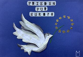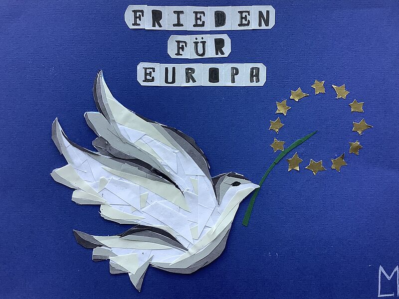 Meisterhaft habe die beiden Schülerinnen ihre zuvor akribisch geschnittenen Papierschnippsel zu einer Friedenstaube gelegt und als Collage auf einen blauen Untergrund geklebt. Dabei wurde in Farbschichten gearbeitet, sodass sogar der Eindruck von Schattierung am Körper der Friedentaube sichtbar wird. Im Schnabel trägt sie einen Zweig, der stellvertretend für Europa steht. Der Text oberhalb der Taube verdeutlicht prägnant den Wunsch für ein Europa, wie es sein sollte.