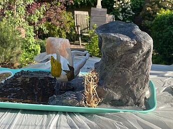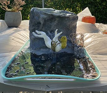Luvi setze sich mit dem Begriff „fallend“ auseinander. Nach dem Verfassen erster Ideenkonzepte, Skizzen und Materialüberlegungen entschied sich Luvi für eine plastische Gestaltung aus Epoxidharz (Wassergestaltung) Steckschaum, Ton (Felsen und Figur), Holzstäbe zum Fixieren und Farbe mit abschließender Glasur. Es gelang ihr damit den Moment des Fallens mithilfe einerdetailliert modellierten menschlichen Figur festzuhalten, die jeden Moment ins Wasser fallen wird.Der Umraum dieser Szene wurde mit den Motiven Felsen, Vegetation und Wasser ebenfallsgestaltet. Luvi selber schreibt folgendes dazu: „Meine Idee hinter dieser Statur zu dem Begriff " fallen/stürzen" ist angelehnt an das Gemälde " gestürzter Engel" von dem Französischen Künstler Alexandre Cabanel. Bei den Begriffen kam mir das Gemälde als erstes in den Sinn, deshalb habe ich den Namen von dem Gemälde in die Realität umgesetzt. Meine Statur zeigt ein Engel der von einer Klippe stürzt und mit dem Rücken zum Boden/ Meer fällt.“