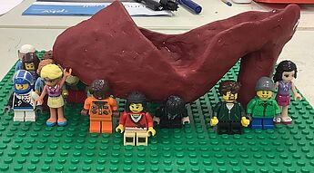 Anika setzte sich mit dem Begriff „gedrückt“ auseinander und entschied sich nach einem Ideenbrainstorming dafür eine gesellschaftskritische Intention künstlerisch umzusetzen. Dafür arbeitete sie kombinatorisch mit den Materialien Modelliermasse, Acrylfarbe und Klarlack (Schuh) und fertigen Legofiguren. Es entstand ein Werk, welches einen roten hochhackigen Schuh zeigt, unter dem zahlreiche Legofiguren stehen und von dem Schuh erdrückt zu werden drohen,oder diesen zu tragen scheinen. Anika schreibt zu ihrem Werk folgendes: „Mein Projekt soll dieGesellschaft symbolisch darstellen, indem alle Menschen von Ungleichheiten unterdrückt werden.Der Schuh ist die Macht und der Einfluss, die unsere Gesellschaft verformen und die Lego-Menschen sind wir, die uns dagegenstellen müssen.“