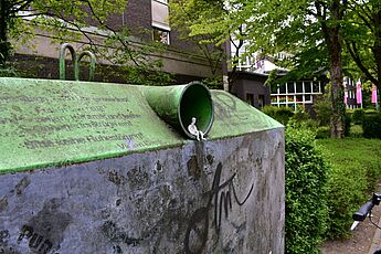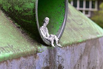 „Die Emotionen, die meine Figur und die Umgebung darstellen sollten, waren Trauer und Einsamkeit. Ich habe versucht wie Slinkachu Settings zu finden, die man sonst im Alltag übersieht und nicht wahrnimmt. Zudem habe ich immer wieder die Umgebung gewechselt und mich vor allem auf ein Umfeld, wehttps://www.wilhelm-hittorf-gymnasium.de/lches verlassen, heruntergekommen aussieht oder man sowieso mit Negativem verbindet (siehe zum Beispiel den Mülleimer oder Abwassergulli) zu beschränken. Mein persönliches Lieblingsfoto ist das auf der Mülltonne, da der Ort mit der Form und den Farben im Hintergrund für mich die Wirkung verstärken. Außerdem wirkt die Figur durch diese Kuhle und der Schwärze dahinter von der Außenwelt sehr abgeschieden und als wäre sie ein Beobachter.“ (Auszug aus dem Kommentar zur Kunstaufgabe vom 15.05.2020)