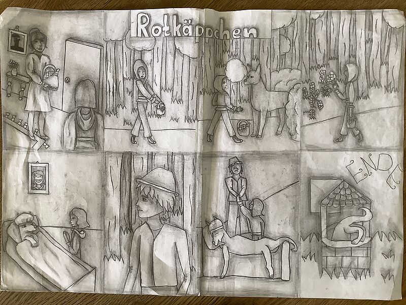 In der Klasse 6b beschäftigten sich die Schüler*innen im Fach Kunst mit dem Thema Bildgeschichte und fragten sich, wie man eine Geschichte nur mit Bildern, ohne Text so darstellen kann, dass die Handlung verständlich und künstlerisch prägnant umgesetzt werden kann. Die Schüler*innen erhielten den Text zum Märchen "Rotkäppchen" und sollten ihn anschließend in eine Bildergeschichte umwandeln. Dabei sollten die einzelnen Handlungsschritte des Textes angemessen visualisiert werden.