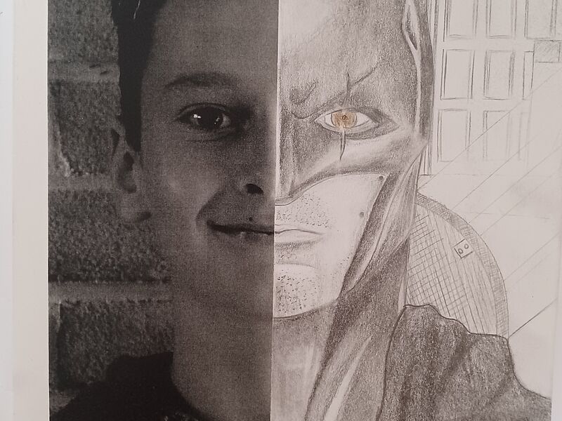 Ein Schüler inszeniert sich in seiner Zeichnung als eine der bekanntesten DC-Comicfiguren und schlüpft in die Rolle des Batman.