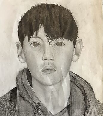mich für Kilian entschieden. Gezeichnet habe ich dann mit Bleistift in verschiedenen Härtegraden (glaube es war HB, 4B und 8B). Ich hab angefangen mit der großen Skizze von den Proportionen, dann hab ich Augen, Mund usw. gezeichnet. Dann kam die Haut und schließlich der Pullover. Insgesamt habe ich ca. 5 Stunden gebraucht. 3 Stunden im Unterricht und 2 Stunden ca. zu Hause.“