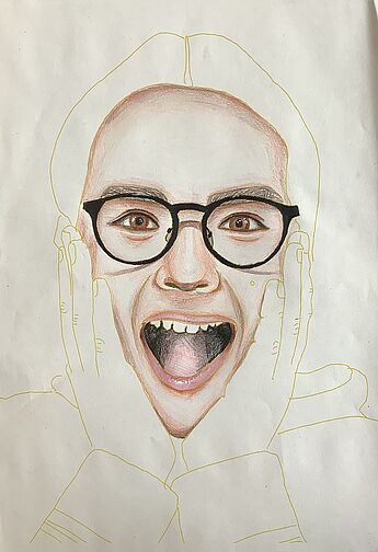 Jette Vossenberg und Milo Schumacher entschieden sich für das Thema „Grimassen“, um sich selbst zeichnerisch in Farbe darzustellen. Bei den beiden Selbstporträts handelt es sich zwar um