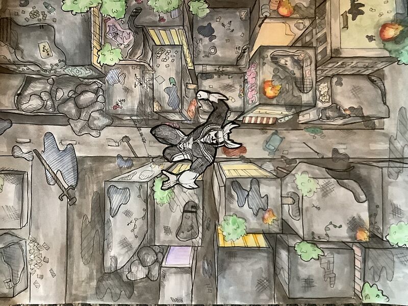 Nach mehreren Wiederholungen und Übungen zum Thema Perspektive, hatten die SchülerInnen der Klassen 8 die Möglichkeit ihre eigenen Superheld:innen zu entwickeln. Aufgabe war es einen Superhelden oder eine Superheldin über eine Stadt fliegend darzustellen. Die Stadt sollte von oben und mithilfe der Zentralperspektive dargestellt werden. Einige Bereiche der Stadt sollten zudem zerstört sein, also ruinenartig aussehen. Entstanden sind die unterschiedlichsten Stadtansichten und SuperheldInnen.
