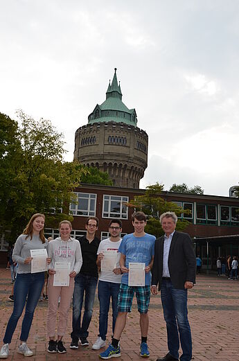 Seit diesem Sommer gehören 13 weitere Schüler/innen des Wilhelm-Hittorf-Gymnasiums dem Club der ausgezeichneten Englischkönner an. Im Rahmen der "Cambridge AG" haben sie sich am WHG ein Jahr lang auf die Prüfung vorbereitet und waren zu den zwei Prüfungsterminen im Juni und Juli in Sachen Vokabeln, Grammatik, Hörverstehen, Sprechen und natürlich Essayschreiben topfit. Das haben die vier Schüler/innen der ehemaligen Q1 (jetzige Q2) sowie die bereits in alle Welt verstreuten und daher beim Fototermin nicht anwesenden Abiturienten/innen nun, da Schulleiter Christian Schrand ihnen die Urkunden überreicht hat (siehe Foto), auch schwarz auf weiß.