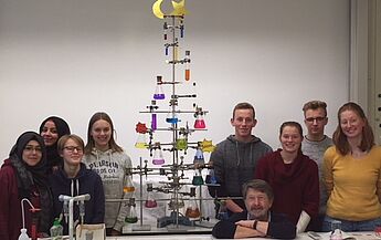 Passend zum Unterrichtsthema "Chemie der Farbstoffe" hat der Chemie-Leistungskurs der Jahrgangsstufe Q2 eine alternativen Weihnachtsbaum gebaut, den ChemisTree.