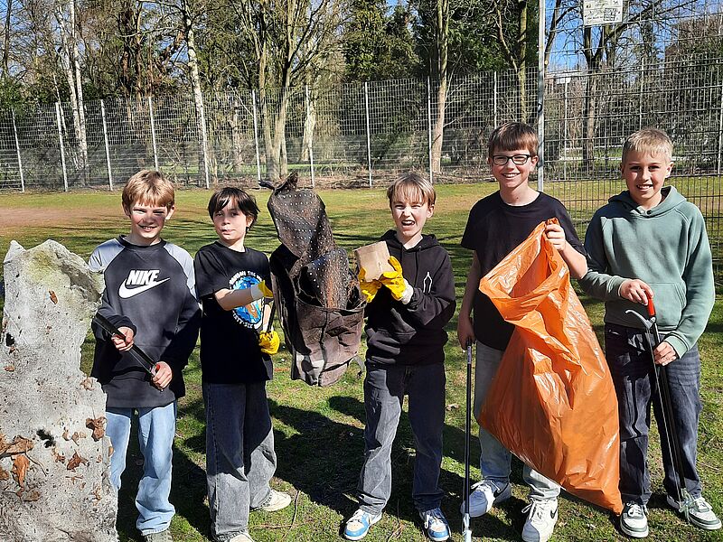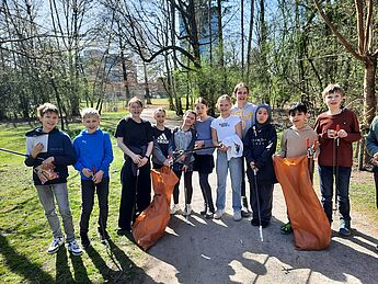Die Klassen 5b und 7b gingen in den Sentmaringer Park. Auf den ersten Blick war der Park sauber und gepflegt. Auf dem zweiten Blick entdeckten die eifrigen Sammler*innen jedoch wirklich viel Müll. Gerade an den Bänken lagen Kronkorken, Flaschen und anderer Verpackungsmüll. Spektakuläre Funde waren ein Springmesser und Reste eines Silvesterfeuerwerks, die wohl tatsächlich seit dem 31.12.24 in dem Park lagen.