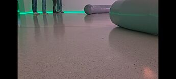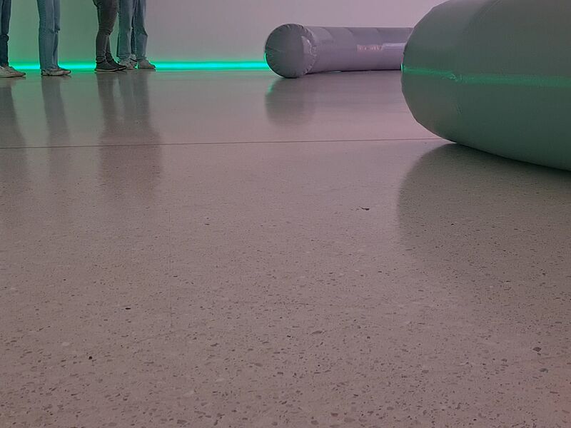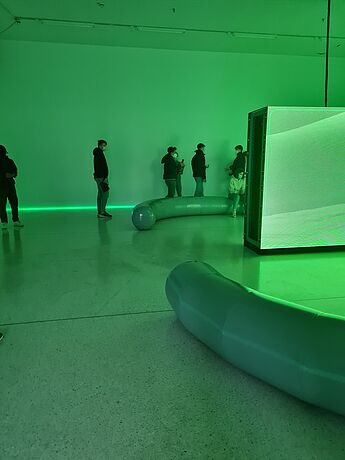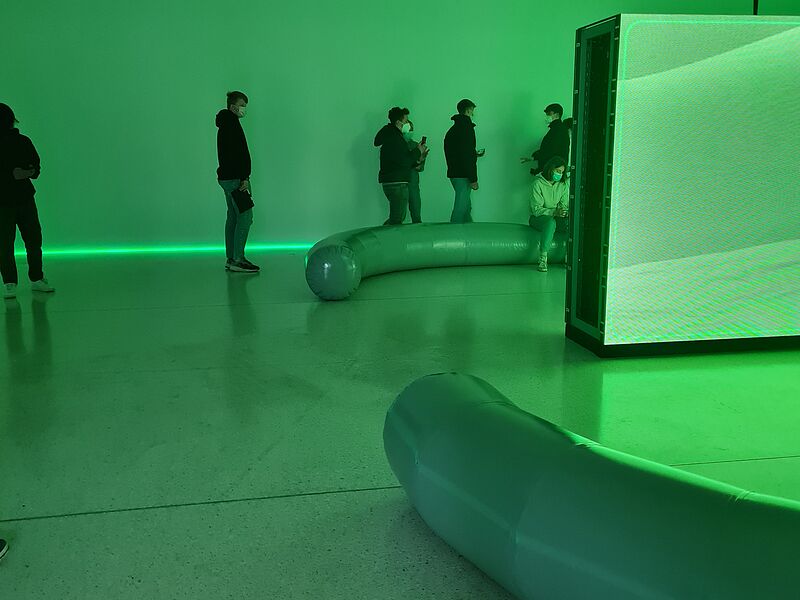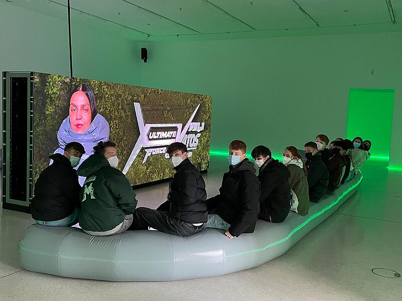 Nachdem die Schüler*innen in den vergangenen Wochen selbst im Kunstunterricht Videos gefilmt und zu erzählenden Sequenzen zusammengeschnitten hatten, bot der Exkurs in den Kunstverein die Möglichkeit, sich mit der Frage auseinanderzusetzen, welche Ausstellungsmöglichkeiten von Videoarbeiten es gibt. Die Ausstellung von Sara Sadik, welche den Raum als Gesamtkonzept in die Gestaltung miteinbezieht, bot den Schüler*innen somit eine spannende Ausstellungswahrnehmung. Grünes Licht durchtränkt den Raum. Rücken an Rücken stehen zwei große Bildschirme. Als Sitzmöglichkeiten laden zwei skulpturale Elemente ein, die jede Bewegung hüpfend und wackelnd weiterleiten.