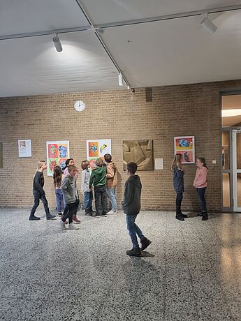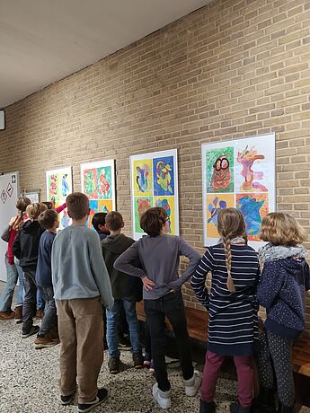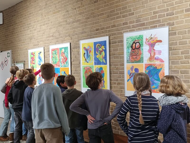 Forschend-entdeckend wurde zunächst untersucht, wie dieses Werk entstanden sein könnte. Anschließend haben die 29 Kinder Ein-Linien-Zeichnungen erstellt und darin eigene Phantasiewesen entdeckt, die farbenfroh in Mischfarben und mit starken Kontrasten umgesetzt wurden. Zu entdecken sind z.B. eine Ente mit Hut, eine Eule mit Brille und viele weitere Tiere/Mischwesen! Heute wurde die Ausstellung im Obergeschoß des A-Traktes offiziell eröffnet und bringt direkt viel Farbe in das Treppenhaus.