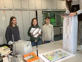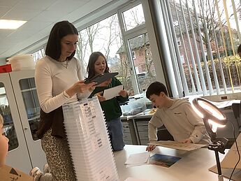 Am Mittwoch, den 10.12. 2025, produzierte die Nachhaltigkeits-AG gemeinsam mit zwei Studierenden der FH Münster einen Film über den Klimastadtvertrag. Die beiden Studentinnen Vivien und Laura schreiben ihre Masterarbeit im Bereich „nachhaltige Transformationsgestaltung“ und arbeiten für dieses Projekt mit der AG zusammen. Gemeinsam mit den beiden Studentinnen und Frau Köhler arbeiteten die fünf Mitgliedern der Nachhaltigkeits-AG (zwei Schüler waren an diesem Tag krank) fast fünf Stunden in den Räumen der Biosammlung.