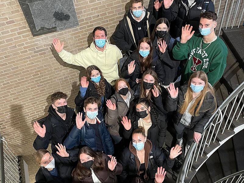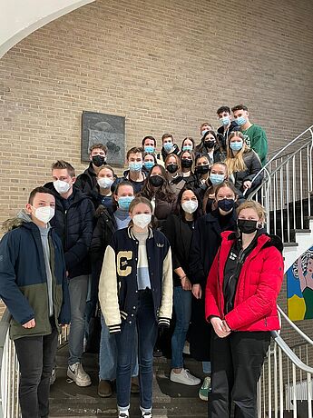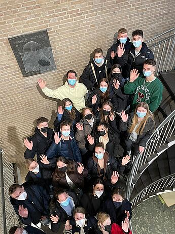 Auf dem Foto sind viele der aktiven SV-Mitglieder zu sehen. Es sind Schüler:innen aus den Jahrgängen 8, 9, EF, Q1 und Q2 vertreten.