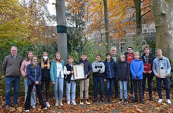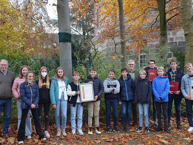 Heute nun gratulieren wir unseren Preisträgern. Auf Landesebene erfolgreich waren Linus Beilmann, Lena Bergmeier, Philipp Börgel, Clara Croepsch, Emil Labuch, Emil Lange, Leonard Linker, Josefine Ludwig, Nika Ludwig, Mio Schulte-Ladbeck, Ole Steens, Josefine Weskamp aus der Jahrgangsstufe 6 mit ihrem Beitrag über den Münsteraner Skateboard-Veteran Titus Dittmann. Sie erhielten den Preis für den landesweit besten Gruppenbeitrag.