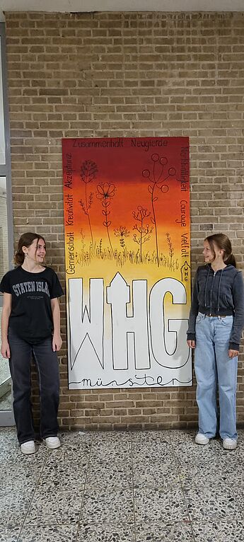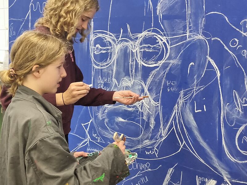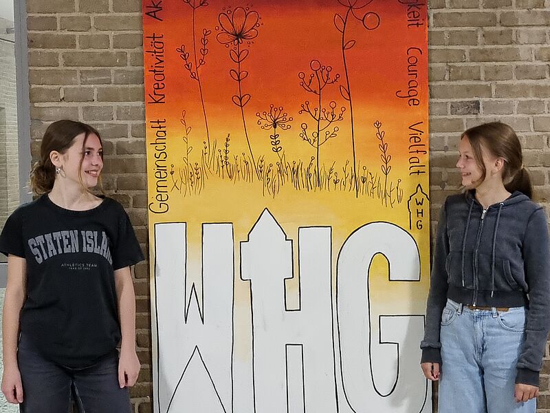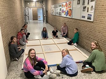 Ein ganz besonderes Dankeschön an unseren Hausmeister Reinhard Baum und Hussein Khanafer, die mit Tatkraft die Leinwand so an die Wand gebracht haben, dass sie sicher und nachhaltig lange dort hängt und den Flur verschönert.