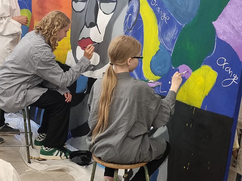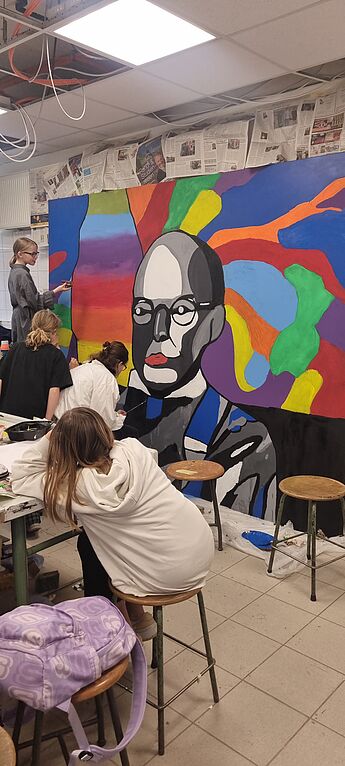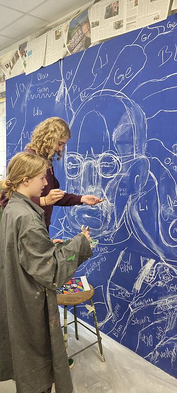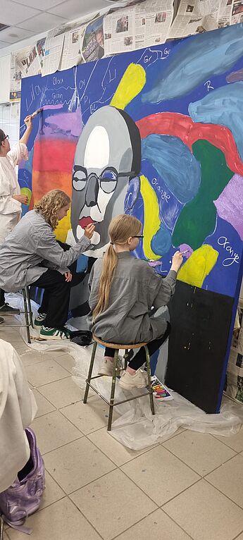 Anlässlich des 200. Geburtstags unseres Schul-Namensgebers Wilhelm Hittorf hat sich eine der zahlreichen Projektgruppen während der Projekttage die Aufgabe gesucht, eine 3 Meter breite und 2,30 Meter hohe Leinwand mit einem fröhlich dreinblickenden Hittorf vor einem sehr bunten Hintergrund samt Wasserturm zu gestalten. Anbei sind einige Fotos vom Entstehungsprozess zu sehen. Ein ganz herzliches Dankeschön an Mia, Anna, Ava, Paula, Antonie, Janna und Marlene aus der 6. Klasse, die dieses Kunstwerk an nur zwei Tagen zum Leben erweckt haben! Danke auch an die zahlreichen Helferinnen und Helfer, die die Leinwand an ihren jetzigen Platz (Flur vor dem großen Kunstraum) transportiert und dort aufgebaut haben.