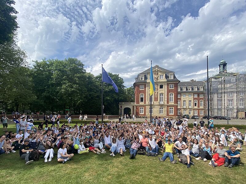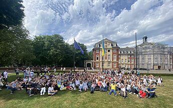 Nach der Schlusskundgebung war noch Zeit für ein Foto aller Hittorf-Teilnehmer:innen vor dem Schloss, bevor es wieder zurück zur Schule ging.