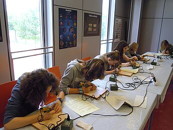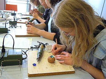 Nachmittags nahmen unsere Schüler/innen an einem Workshop zum Schneiden von Gemmen teil. Eine Gemme ist ein sehr harter Stein, in den ein Steinschneider verschiedene Bilder, Figuren oder Symbole geritzt hat. Bei den Römern wurden Gemmen meist als Schmuck in einem Ring getragen. Unsere Lateiner benutzen Glasgemmen, in die sie individuelle Motive schnitten.