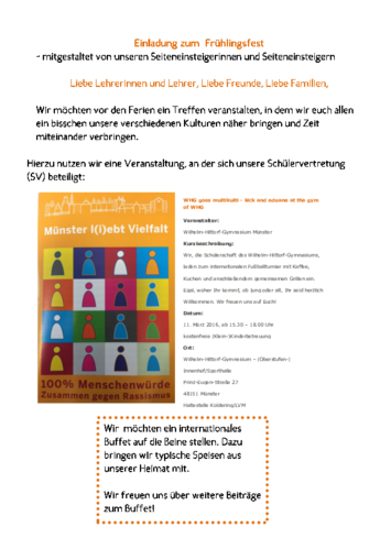 wir möchten vor den Ferien ein Treffen veranstalten, in dem wir euch alle ein bisschen unsere verschiedenen Kulturen näher bringen und Zeit miteinander verbringen.
