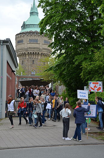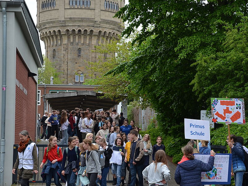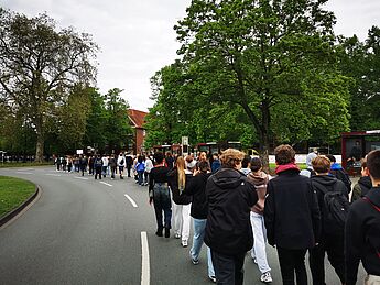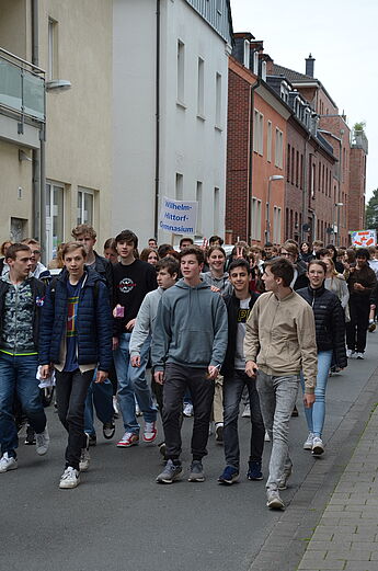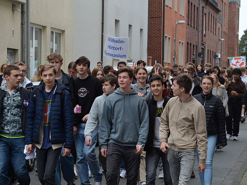 Und auch wir vom Hittorf sind mit dabei! 140 Schüler*innen aus der Klasse 7 und der Jgst. EF werden um 10:15 Uhr vor der Schule von einem Streifenwagen abgeholt, auch Teilnehmer*innen der Primus-Schule stoßen dazu. Der Weg führt uns über die Turmstraße zur Hammerstraße: Dort kommt der Verkehr zum Erliegen, als unser Tross vom Polizeiwagen angeführt mitten auf der Fahrbahn in Richtung Kreisverkehr marschiert, diesen überquert und in die Innenstadt einzieht.