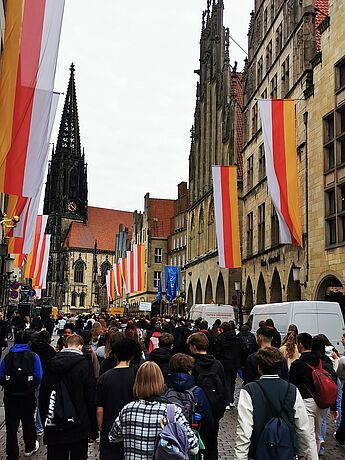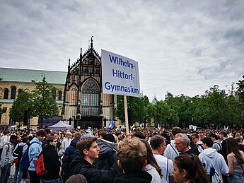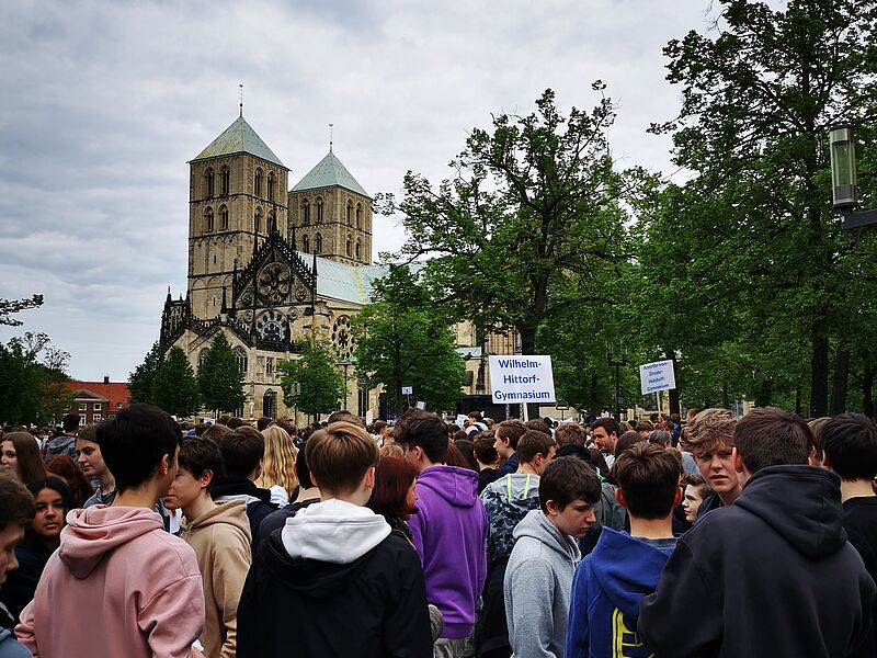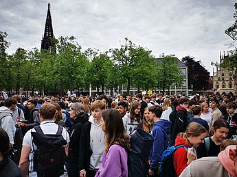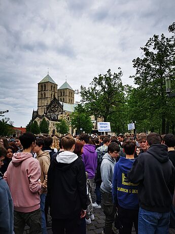 Am Freitag, 12.05. kommen ca. 7000 Schüler*innen aus Münsters Schulen nach einem Sternmarsch von ihren Schulen auf dem Domplatz zusammen, um ein Zeichen zu setzen und ihren Wunsch nach Frieden zu demonstrieren.