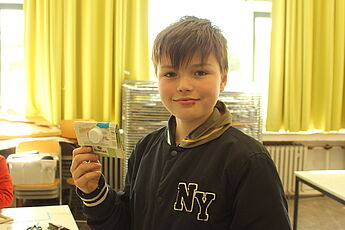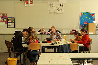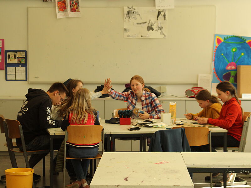 Die ganzen Materialien haben wir auf einem Tisch ausgestellt und haben los gebastelt. Zwei Q2-Schüler, Luca und Wiebke, haben uns dabei geholfen.