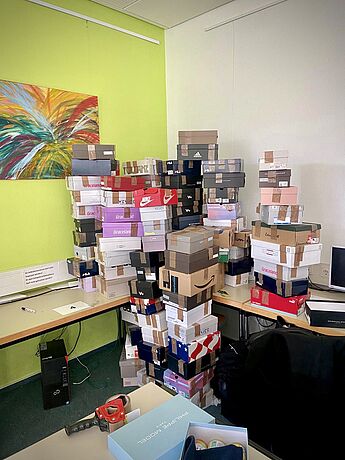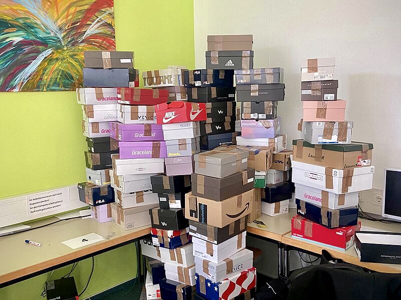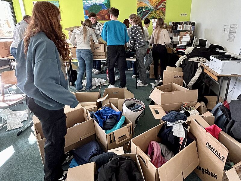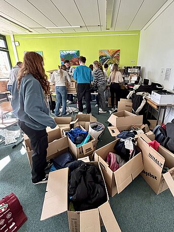 Etwa zwanzig Schüler*innen der SV haben nun in einer mehrstündigen Aktion am Nachmittag alle Sachspenden kategorisiert und sortiert. Um jeweils einem Kind eine kleine Freude bereiten zu können, haben wir dazu Schuhkartons mit schönen und praktischen Dingen gepackt. Nach einer intensiven Aktion können wir das fantastische Ergebnis von ca. 110 gepackten Schuhkartons und 15 Umzugskartons mit Hilfsgütern festhalten.