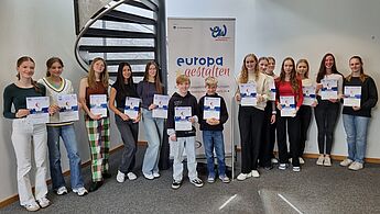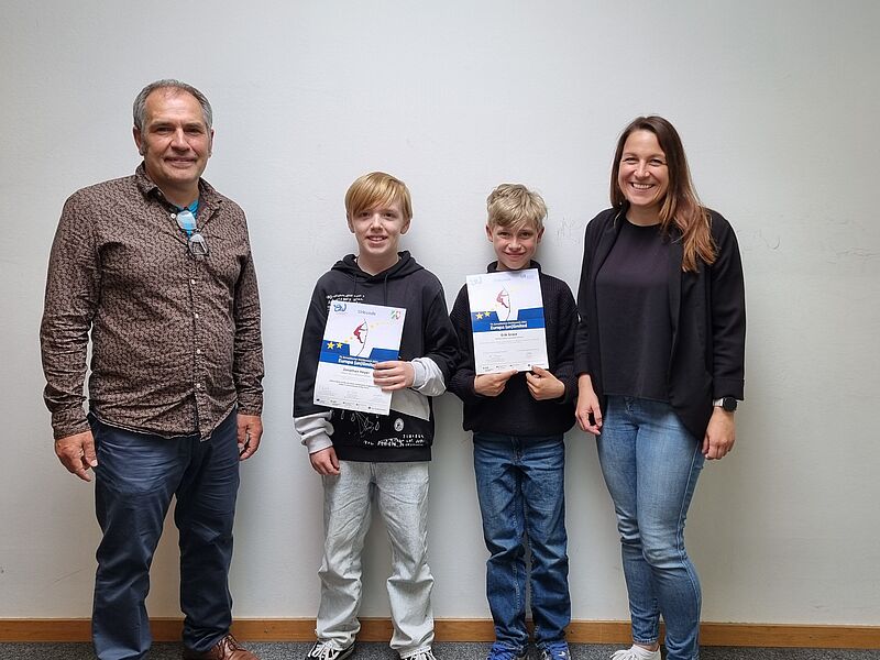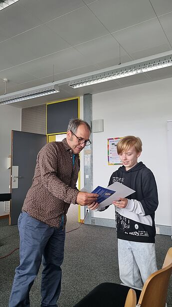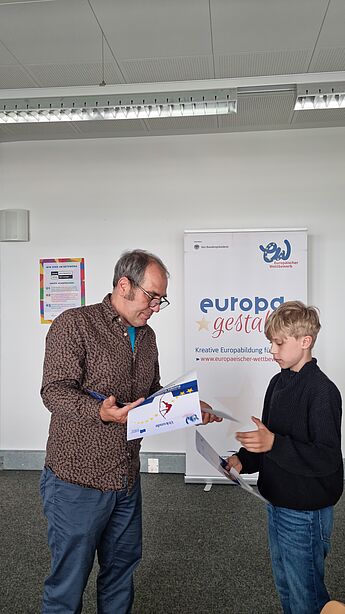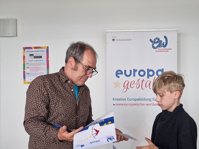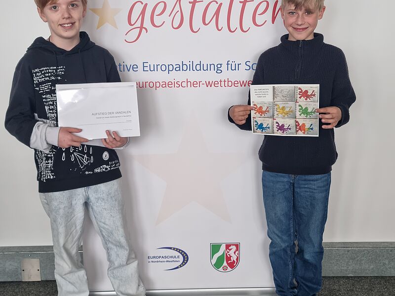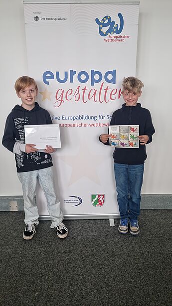 Beide Schüler erzielten einen Landespreis (2. und 3. Preis) und ihre Ergebnisse wurden sogar der Bundesjury vorgelegt. Beim Europäischen Wettbewerb, der unter dem Motto "Europa (un)limited" stand, reichten im Regierungsbezirk Münster über 100 Kinder 57 Beiträge ein. 11 davon wurden am 5.6. von Christian Schneider, dem Koordinator des Europäischen Wettbewerbs, mit Preisen ausgezeichnet. Betreut wurden die Beiträge von Frau Reinhart und Herrn Trütken-Kirsch. Wir gratulieren ganz herzlich zu diesem großartigen Erfolg!