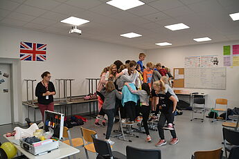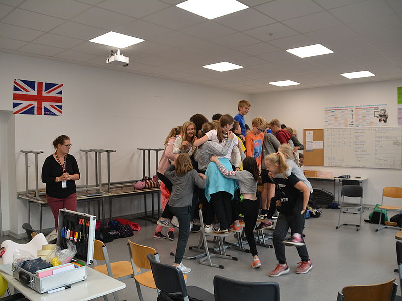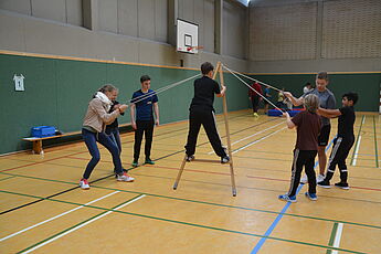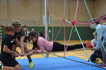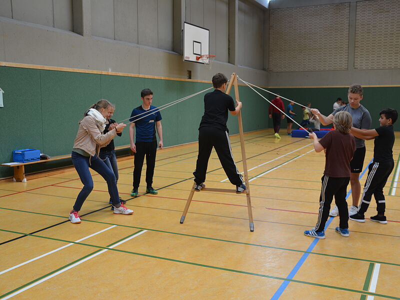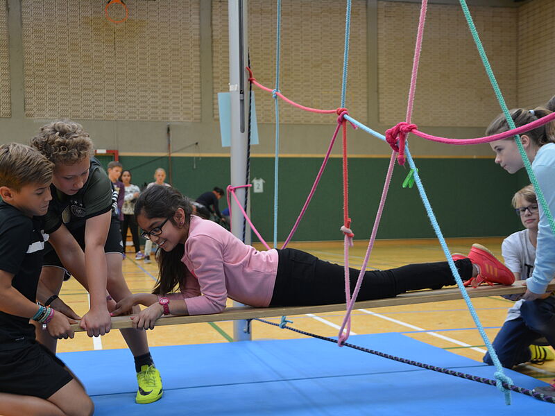 Alle Schülerinnen und Schüler der Klassen 6 durchliefen nach einer Einführung im Klassenverband mit abwechslungsreichen gruppendynamischen Spielen einen erlebnispädagogischen Zehn-Stationen-Parcours in der Spielhalle, den sie mit viel Spaß absolvierten. Dabei boten sich ihnen verschiedene Möglichkeiten, gemeinsam Aspekte positiven sozialen Verhaltens zu erleben und kooperative Fähigkeiten zu erproben. Nur mit gegenseitiger Hilfe konnten die Aufgaben gelöst werden. Ganz herzlich bedanken wir uns bei den Sporthelfern und -helferinnen, die verschiedene Stationen sehr engagiert und kompetent betreut haben.