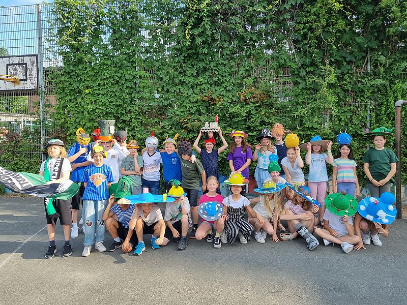 Dann fand die Abschlusspräsentation in Form einer Modenschau auf dem Schulhof statt, in der jede*r sein Hutmodell in Szene setzen konnte. Zu bestaunen waren z.B. ein Eulenhut im Federkleid, diverse Helme aus verschiedenen Zeitaltern, bekannte Hüte (z.B. Asterix' Hut), diverse "Urlaubshüte" mit Sand, Meer und Palmen, die bereits Vorfreude auf die anstehenden Ferien machen, aber auch münsterspezifische Hüte, Fußballhüte und stachelig-gefährliche Hüte konnte man entdecken. Die tollen Hüte finden nun hoffentlich zu Hause einen geeigneten Platz und regen dazu an, auch in den Ferien kreativ zu werden. Schöne Ferien wünschen