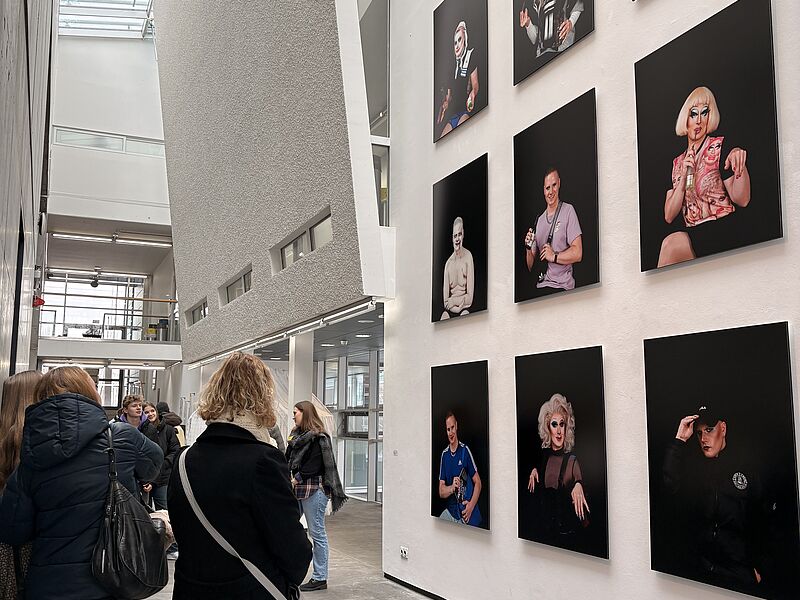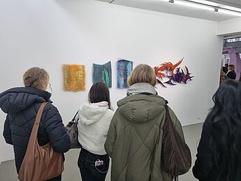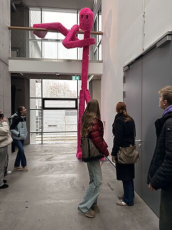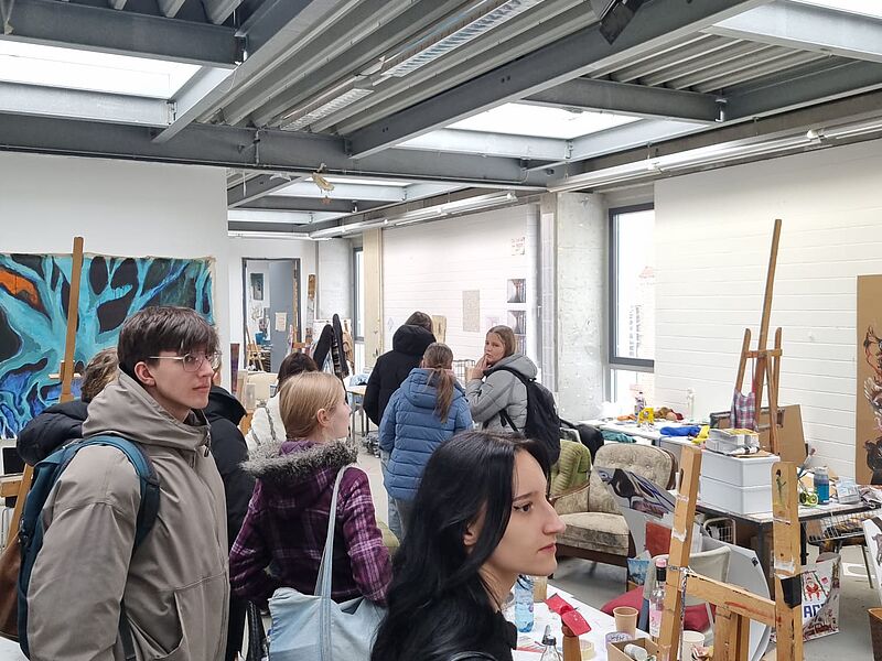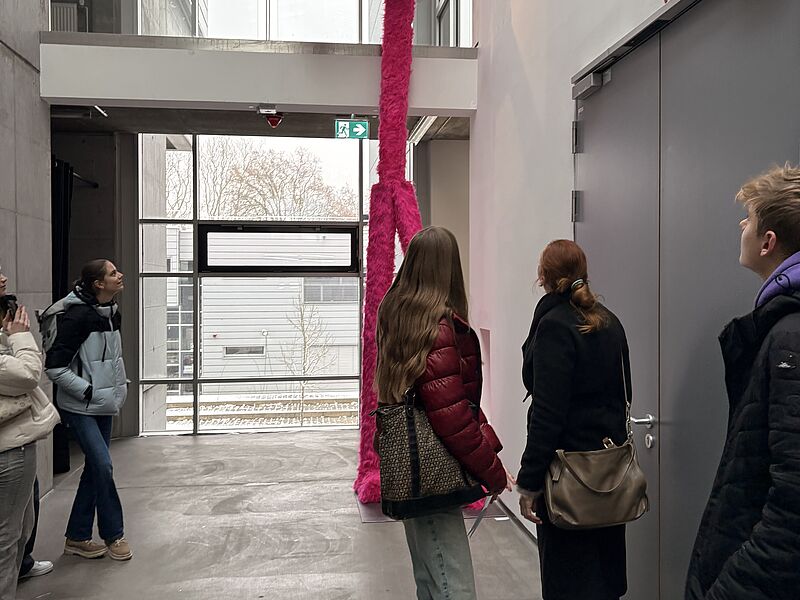 Studierende führten uns durch die riesige und extrem vielfältige Ausstellung, brachten die Schüler*innen mit den Künstler*innen ins Gespräch und erklärten die Ausstellungskonzepte der einzelnen „Klassen“. Die Studierenden zeigten Arbeiten zu unterschiedlichsten Themen und Techniken von Malerei, über filmende Gottesanbeterinnen, durch deren „Augen“ ein Kurs den anderen in einem völlig anderen Raum beobachten konnte, viele Plastiken, Film, Installationen und kreative Mitmachprojekte wie Murmelbahnen oder Sportfelder in den Ateliers.
