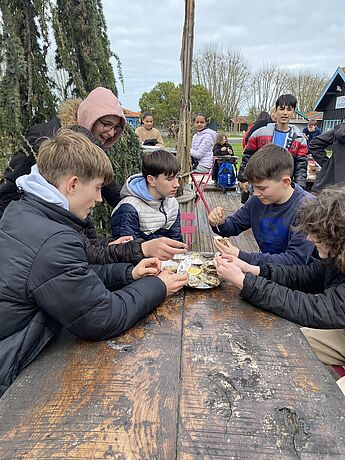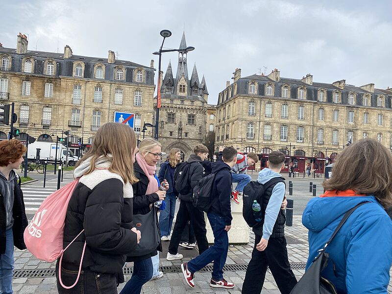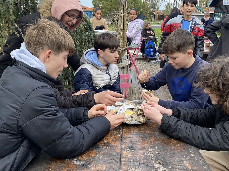 In Libourne bekamen die deutschen Schüler*innen einen Einblick in das französische Schulleben. Außerdem lernten sie in einem Kochunterricht an der Schule, wie man Cookies zubereitet. An einem Tag besuchten sie die Stadt Bordeaux und erkundeten sie anhand einer Rallye. Auch in Bordeaux bekamen die Schüler*innen die politischen Entscheidungen, z.B. in Form von Unterrichtsausfall oder Streiks der öffentlichen Verkehrsmittel, zu spüren. Außerdem wurden sie im Rathaus von Libourne feierlich empfangen, im Anschluss inspizierten sie den Markt in Libourne und lernten auf diese Weise eine typisch französische Markhallte mit ihren kulinarischen Angeboten kennen. Auf dem Programm stand ebenfalls eine gemeinsame Fahrt der ganzen Gruppe in die Bucht von Arcachon, wo Austern probiert wurden, und zur Dune du Pyla.