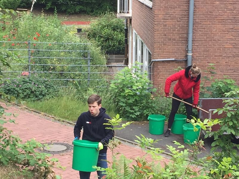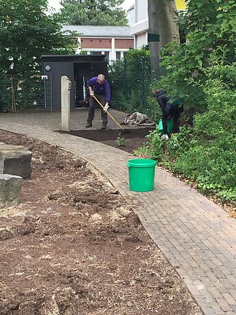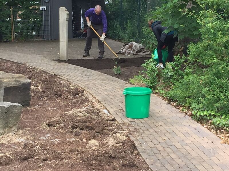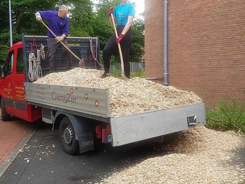 Im Rahmen dieses ganz besonderen Corona-Projekts wird der alte Rindenmulch gegen vegetarische Hackschnitzel getauscht. Zunächst musste aber jede Menge Mutterboden auf ein neues Beet gebracht werden und der alte Mulch abgetragen werden. Trotz recht niedriger Temperaturen kamen die Schüler dabei ins Schwitzen und hatten großes Glück, dass der Regen erst nach der Arbeit runterkam. Mittwoch und nächste Woche geht es weiter, damit das grüne Klassenzimmer zu Beginn des nächsten Schuljahr wieder für den Unterricht an frischer, virenfreier Luft zur Verfügung steht.