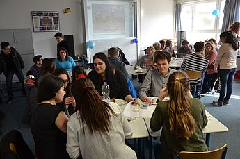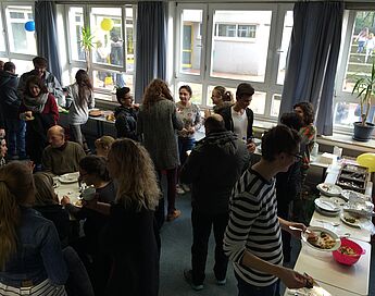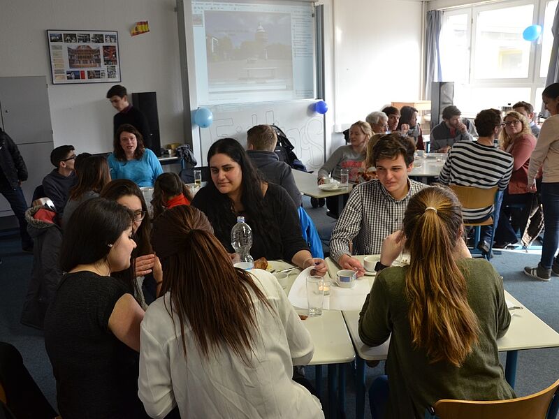 Im Sprachenraum war ein reichhaltiges Buffet mit verschiedensten Speisen von zuckersüß bis herzhaft-pikant aufgebaut. Die Idee zum internationalen Buffet ist durch die Zusammenarbeit von Frau Dreier und Frau Börger mit den Schülern aus der DaZ-Klasse entstanden. Die Schülerinnen und Schüler aus Syrien, Ghana, Polen, Bosnien-Herzegowina, Bulgarien, Italien, Albanien, Lettland und dem Iran, die neben dem Unterricht in Schulklassen eine besondere Förderung im Fach Deutsch erhalten, luden ihre Schülerpaten, Unterstützer aus der WHG-Eltern- und Schülerschaft, Mitschüler, Lehrer, Freunde und Familien zum gemeinsamen Feiern ein.