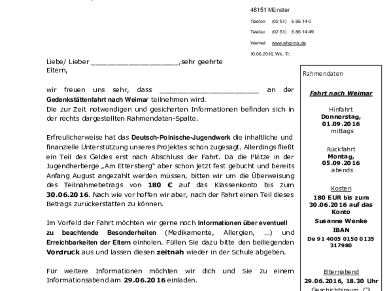 Am letzten Schultag treffen sich alle Mitfahrenden in den ersten zwei Stunden zur inhaltlichen Vorbereitung: Freitag, 08.07.2016, 1. und 2. Stunde im Raum B202