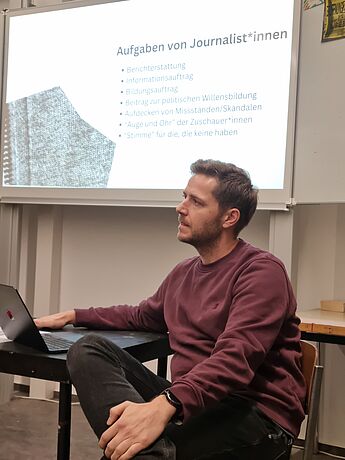 "Journalismus macht Schule" lautet die bundesweite Initiative zur Stärkung von Nachrichten- und Informationskompetenz. Sich möglichst umfassend, ausgewogen und faktenbasiert über das Zeitgeschehen zu informieren, aber auch Desinformationen zu entlarven kann erlernt werden und ist für alle Fächer relevant. Der Kunst-LK erhielt außerdem die Gelegenheit viele Fragen zu stellen und mit dem Journalisten ins Gespräch zu kommen. Eine sehr gewinnbringende Veranstaltung - vielen Dank für den Besuch bei uns!